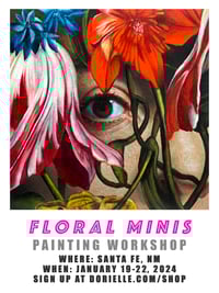 In this 4-day oil painting workshop, we will focus on creating 1-2 mini paintings (approximately 5x5-8x8 inches...your choice) of flowers (leaves or cactuses too!) with aspect of the face peaking through the flora. Students will have the choice between choosing their own face or the face of one of my models to work from.